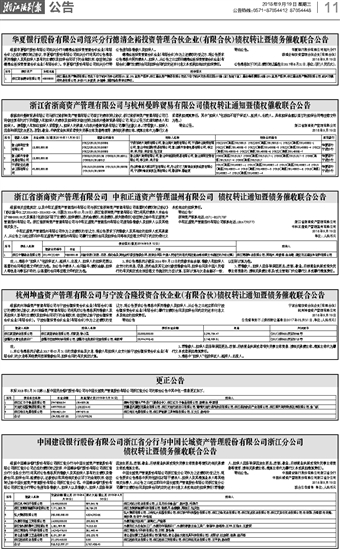 中国建设银行股份有限公司浙江省分行与中国长城资产管理股份有限公司浙江分公司 债权转让暨债务催收联合公告