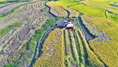 近日,江西省永丰县中稻陆续成熟,进入收割期,当地农民抓住晴好天气抢收水稻,确保颗粒归仓。