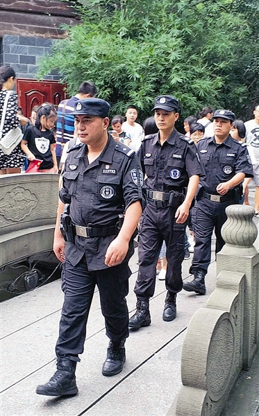 9月19日,杭州的最高气温超过30℃,但西湖景区的游客并未明显减少。一名身材壮实的民警带着一支穿着特警制服的巡逻队,行走在游客中间,不时观察四周情况,脸上布满细细密密的汗珠。