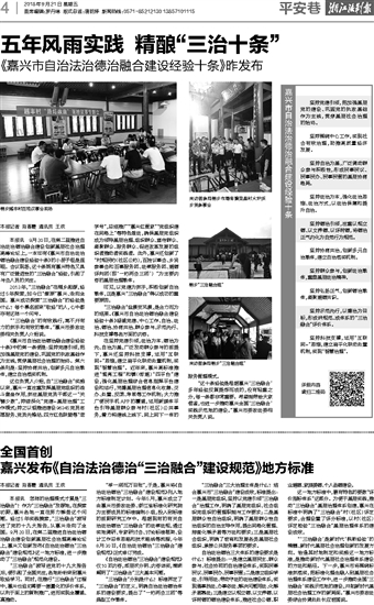 全国首创 嘉兴发布《自治法治德治“三治融合”建设规范》地方标准