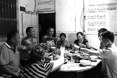 一大早,轮休的民警们就忙着去菜场挑选新鲜食材,然后驱车前往外垟村留守老人廖叔叔的家,又洗又切又烧,为村里的留守老人们准备了一桌“中秋团圆家宴”。“叔叔,阿姨,开饭啦,我们一起过节啦!”在民警们的招呼下,外垟村就这样热闹了起来……