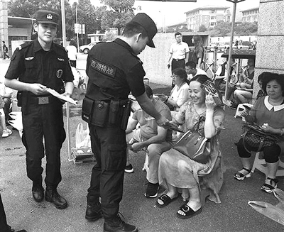 为增强学生对诈骗等违法犯罪行为的防范意识,近日,杭州市公安局西湖巡特警大队PTU中队在辖区内各大高校进行了大学生防诈骗主题活动。图为特警队员向学生家长发放宣传册。通讯员 郑伟