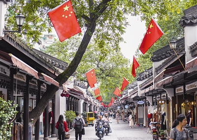 国庆节临近,杭城街头巷尾都插上了一面面鲜艳的五星红旗,喜迎新中国69周年华诞。昨日,杭州中国丝绸城的每家商铺门前都挂起了五星红旗。董旭明 摄