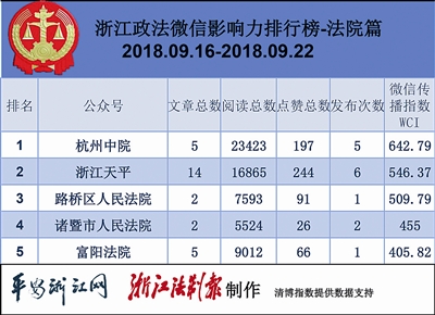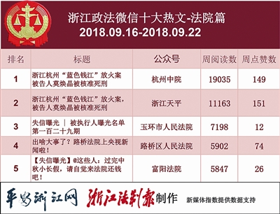 本期法院榜,“杭州中院”名列前茅,该公众号的《浙江杭州“蓝色钱江”放火案 被告人莫焕晶被核准死刑》一文颇受关注,文章以热点案件为题材发布权威消息,告诉人们正义永远不会缺席。