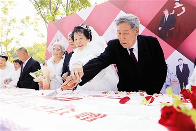 9月26日,在石家庄市植物园,一对金婚夫妇正在切蛋糕。