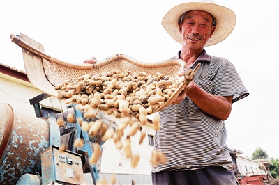 9月25日,山东省青岛西海岸新区塔桥村的村民在晾晒花生。