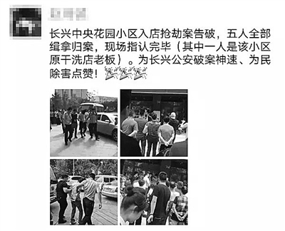 9月28日,家住长兴中央大道附近的杨女士,见证长兴警方3小时速破一起入室抢劫案,将嫌疑人抓获的图片发至朋友圈后,引得好友纷纷点赞。原来,就在前几天,中央大道的某保健品店遭到5名歹徒的抢劫,经警方全力侦查,案发3小时后,嫌疑人在安徽广德县某公园内被全部抓获。