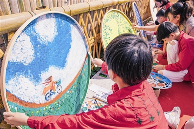 10月7日上午,50位小画家齐聚温岭市城南小学“田缘书乡”绿色教育实践基地,共同绘制团箕画,美化乡村。孩子们有的描绘了灵秀城南的自然风光,有的记录了这片土地上曾经发生过的历史文化故事,用作品寄托对城南镇蝶变的美好祝愿。