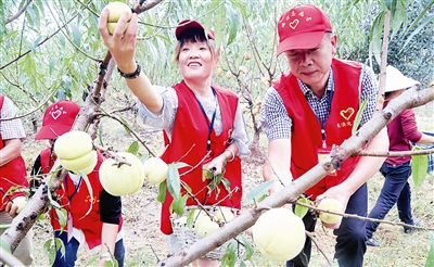 昨日,在德清县舞阳街道山民村家庭农场,当地居民代表、党员志愿者正在帮助农户采摘冬桃。当下正值冬桃丰收季,舞阳街道人大工委成立助农服务队,新当选的74名居民代表及青年党员志愿者分片帮助农户联系销路,并及时采摘、运输冬桃。