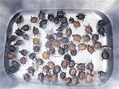 申报为婴儿零食,实际是活体小乌龟!近日,广州海关在进境邮包中查获75只活体乌龟。据悉,广州海关今年以来已在进境国际邮件中截获锹甲、乌鱼子、小乌龟等禁止进境的活体动物6批次。