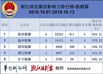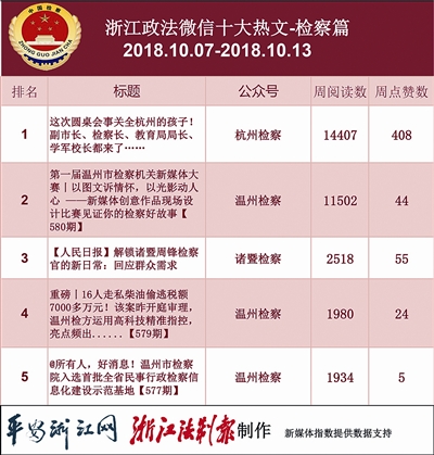 检察院榜单中,“杭州检察”继续蝉联第一。其《这次圆桌会事关全杭州的孩子!副市长、检察长、教育局局长、学军校长都来了…》一文阅读量和点赞量均获第一。该文记录了以“青少年法治教育——检察长进校园”为主题的一场沙龙活动,标题悬念重重,吸引了不少读者。
