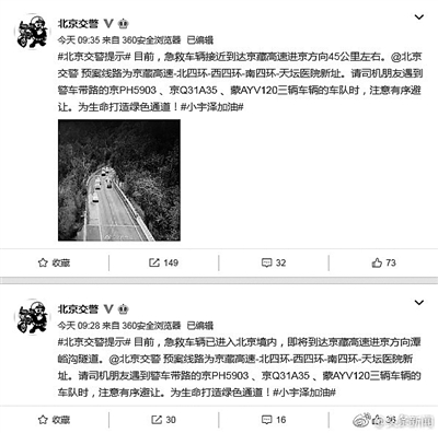 这个无数人为他护航让路的孩子 平安到达北京天坛医院啦!