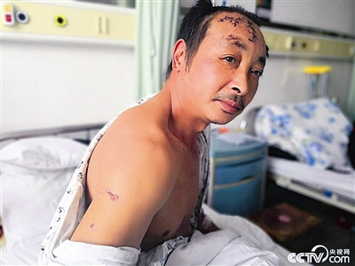 图为10月15日,在陕西汉中南郑区医院外科病房内,躺在病床上的谭华江。45岁的村民谭华江10月8日在山里采蘑菇时撞见一大一小两只黑熊,他被大熊袭击,头部及全身多处受伤。为逃生他跳下悬崖,最终脱险。 视觉中国
