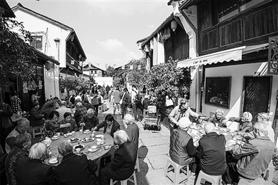 重阳节当日,杭州市拱墅区“金秋贺喜寿,百家宴重阳”活动在小河直街历史文化街区隆重举行,200位老人共度重阳佳节。