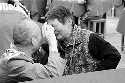 当天,第二分监狱的小操场被布置得很温馨,32张桌子上摆好了水果和茶水,从各地赶来的服刑人员家属坐在桌边翘首以待。在监狱民警的带领下,服刑人员陆续走向亲人所在的位置。人群中,一名阿婆紧盯着服刑人员队伍,当看到三年不见的小儿子郑某朝自己走来时,阿婆的眼睛红了。