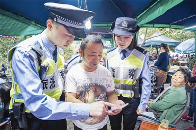“民警同志,我想去公交车站,要怎么走?”“顺着这个方向,走到底就是。”金建达热心地为游客指路。从警1年多的他已经对景区的道路非常熟悉。当天是星期天,游客众多,问路的也多,金建达和陈霞不厌其烦地一一指路。