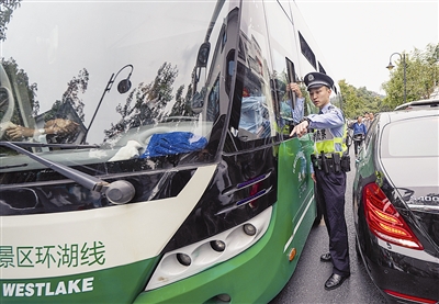 游客们都很悠闲,金建达和陈霞的精神却一直紧绷着,时刻注意着四处情况。在下满觉陇100号附近,突然出现了路阻情况,司机们焦躁地按着喇叭。金建达赶紧小跑着上去看看啥情况。原来,一辆白色的丰田商务车停靠位置不当,使得一辆公交车无法通过,并不宽敞的满觉陇路瞬间“肠梗阻”起来。
