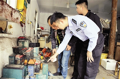 近日,临海市公安局杜桥派出所加大对电动车修理网点的管理力度,重点检查回收电瓶实名登记情况,排查来路不明的电瓶,从源头上遏制电瓶被盗案件的发生。图为昨日,民警在一电动车维修点询问旧电瓶的来源。通讯员 叶明銮 摄