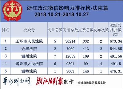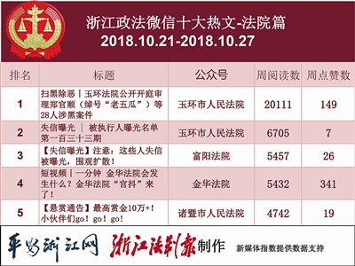 法院榜单上,“玉环市人民法院”获得第一。排名前三的热文中,有两篇内容为失信曝光,还有一篇有关涉黑涉恶。读者们对违法行为的关注也表明了大家对创建诚信平安社会的强烈愿望。