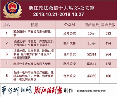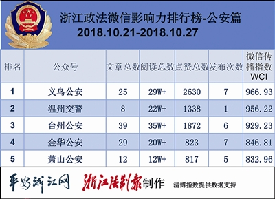 本期公安榜,“义乌公安”和“温州交警”都有阅读量10万+好文产生。分别是“义乌公安”的《紧急通告!所有义乌家长请注意!》和“温州交警”的《权威发布!即日起,严查这三类交通违法!交警喊你来举报!》,两篇文章都和老百姓生活息息相关,难怪获得如此多的关注。