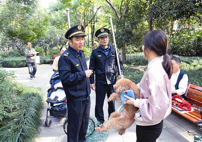 | 未在规定时间内遛狗,执法队员对市民进行劝导 |