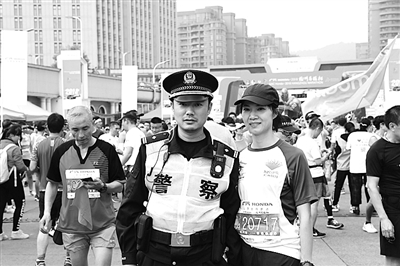 杭州市西湖区公安分局基层基础管理大队民警周丹萍,曾获得绍兴国际马拉松比赛女子组冠军,此次用4小时跑完了全马。她的丈夫玉泉派出所副所长钱争强,则在杭州黄龙体育中心,也就是全马的起点和终点,连续执勤了7个多小时。跑到终点的周丹萍,占用丈夫3秒钟时间拍了一张合影。同事们笑称;“你们两夫妻,一个代表了杭州民警的耐力,一个代表了杭州民警的担当!”