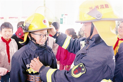 11月9日全国消防日即将来临之际,各地学校纷纷组织开展消防安全主题活动,提高学生们的消防安全意识。图为江苏省苏州市金阊实验小学的学生在消防员的指导下体验穿戴消防装备。