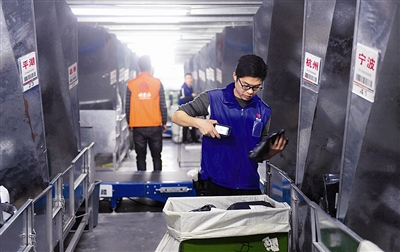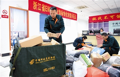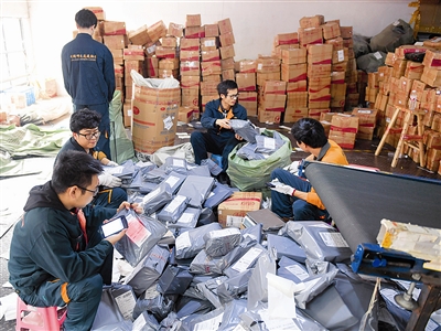 很快,我就被送到了中国邮政集团义乌分公司浪仕威处理点。这里我的兄弟姐妹真多,毛估估有数十万件吧,大家挤挤挨挨,好不热闹(图①)。围着我们的是30余名穿着绿色衣服的邮政工作人员,他们拿起我的兄弟姐妹扫码,再打包、装车(图②)。听他们说,从11日开始,为了能让我们尽快送到主人手里,所有员工都主动放弃了休息。真辛苦啊!