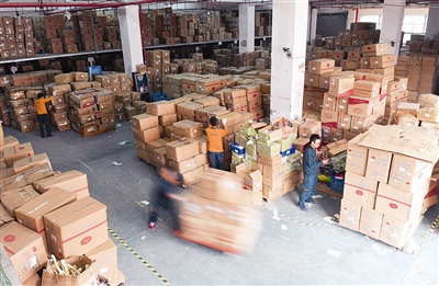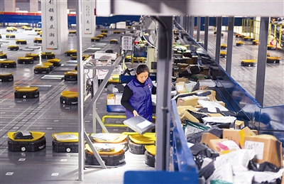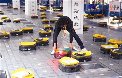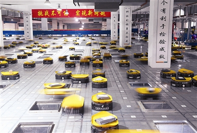 听着车外呼啸而过的车声,我知道自己正奔向主人。不久,车子停了,我睁开惺忪睡眼,发现自己来到了中国邮政义乌后宅处理中心。天啊,这里怎么这么多包裹,难道这就是人们说的“爆仓”?还没回过神,我又被眼前萌翻的“小黄人”惊到了,约2000平方米的场地上,350个“小黄人”正来来回回穿梭,看得我目不暇接(图③)。