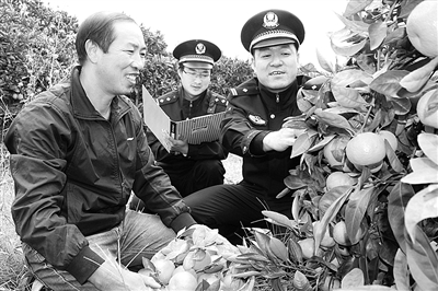眼下正值桔子采摘时节,近日,台州市公安局椒江区分局章安派出所民警走进辖区桔园,向桔农讲解防盗、防火等安全防范知识,提高他们的安全防范意识,并帮助采摘桔子,受到群众好评。
