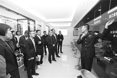 温州龙湾公安分局强力推进流动人口服务管理提升工程,组建房东自主管理协会,成立出租房服务总台,民警和网格员当起“中介小哥”,为外来务工人员提供“一站式”办证登记、房屋租赁等服务。图为昨日状元派出所民警在介绍出租房“旅业式”管理经验。