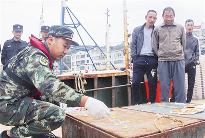 连日来,宁波边防支队石浦边防派出所组织开展石浦港禁毒专项行动,联合渔船网格长逐条渔船排查,已检查船舶160余艘,检测人员100余人,查破贩毒案1起,查处吸毒案2起。图为尿检现场。通讯员 翟志浩 摄