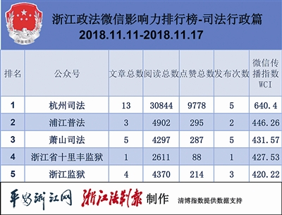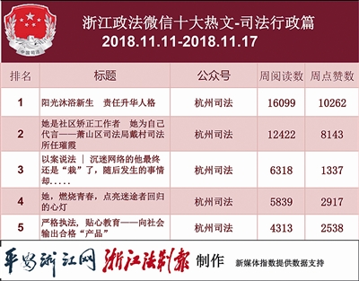 本期司法行政热文榜,“杭州司法”依旧“刷屏”式地霸榜,前五热文都来自“杭州司法”。其《阳光沐浴新生 责任升华人格》一文点赞数更是突破1万,文章介绍了一名年轻基层司法所所长俞祖光的工作,展示了新一代司法工作人员的风采。
