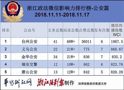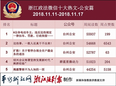 本期公安榜,“台州公安”重回榜首。同时,在热文榜前五名中,“台州公安”占据四篇。其中,《@全体电动车主,违反这些规定一律扣车、罚款、行政拘留……》一文脱颖而出。如今马路上电动车越来越多,以此话题切入,难怪该文关注度如此之高。
