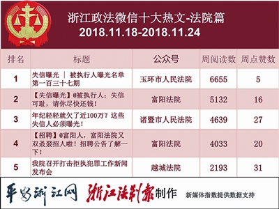 本期法院热文榜,“老赖”话题依旧热门。吸睛度最高的是“玉环市人民法院”的《失信曝光| 被执行人曝光名单第一百三十七期》一文。被这么多人“围观”,也是很丢脸,所以,大家一定要以此为戒,千万别做“老赖”。