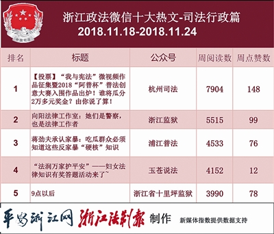 本期司法行政榜,前三分别是“杭州司法”“浙江监狱”“浦江普法”。“杭州司法”的《【投票】“我与宪法”微视频作品征集暨2018“阿普杯”普法创意大赛入围作品出炉!谁将瓜分2万多元奖金?由你说了算!》一文语言生动活泼,点击率颇高。看来,投票活动是提高文章阅读数的“法宝”之一。