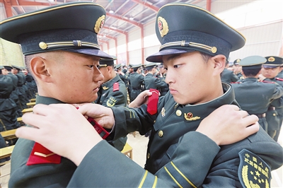 大学生新兵杨帆在授衔后兴奋地说:“授衔仪式标志着我的军旅生涯真正开始,我会以此为动力,勇往直前,发扬‘一不怕苦、二不怕死’的战斗精神。”