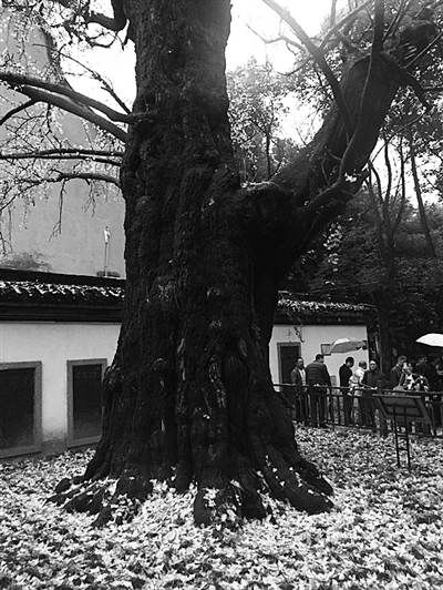 12月4日下午,伴着绵绵冬雨,位于嘉兴秀洲区新塍镇小蓬莱古树公园内的千年银杏静静地守护在江南名刹能仁寺旁,满地黄叶呈露出眩目的金色。周卫文静静站着,不忍踩踏挪步。他和树打了30年交道,过去一直默默无闻。不过随着4日、5日两天浙江古树名木保护现场会的召开,很多像周卫文这样的守树人走到台前,“让每株古树名木都能‘老有所养’”的口号也变得更为响亮。
