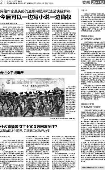 随后,杭州互联网法院召开新闻发布会,介绍了司法区块链的运行情况。该院副院长王江桥表示,“司法区块链尤其适用于数字版权保护,可以有效解决以往网络作家维权取证难、确权难等一揽子问题。”