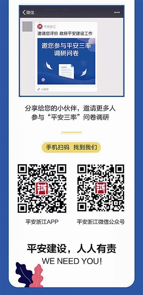 您可以在“平安三率”调研问卷小程序、“平安浙江”手机客户端、“平安浙江”官方微信等渠道参与本次活动。每人仅限参与一次,记得选择您所在地区。本次“平安三率”问卷调研活动时间截至2018年12月31日,赶紧拿起您的手机,为家乡的平安建设提供宝贵的意见。