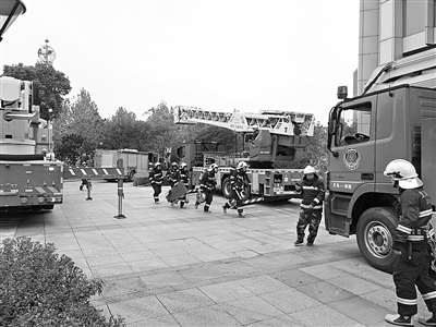 本报讯 近日,义乌广播电视台开展消防实战演习,以进一步增强员工的消防安全意识。演习中,广电大楼8楼突发“火灾”,有多名人员被困。119指挥中心收到报警后,按照“一处报警、多点调派、多线并进、编成出动”的原则,调派辖区内13辆消防车、69名指战员火速赶至现场,迅速“救出”被困人员并扑灭“大火”。