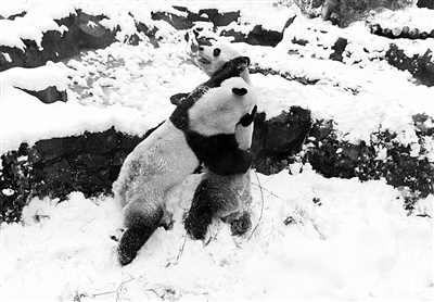 昨日,雪后的杭州动物园里,大熊猫“成就”和“双好”在雪地里滚作一团,开心玩耍。