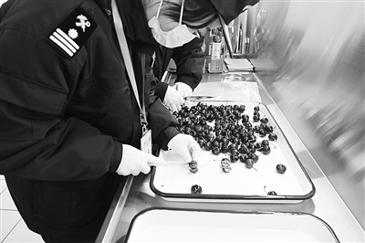 为了让百姓尽快吃到安全、放心的新鲜樱桃,杭州海关隶属萧山机场海关的关员们一早就来到监管现场,核对完产地、出产果园等“身份信息”后,快速展开现场剖果、采样送检等工作,确保这批樱桃在符合国门生物安全和食品安全的前提下快速通关。图为海关关员现场剖果检查。