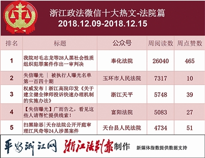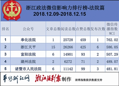本期法院榜,前三分别是“奉化法院”“浙江天平”“富阳法院”。“奉化法院”的《我院对毛志龙等28人黑社会性质组织犯罪案件作出一审判决》收获阅读数2万+,点赞数也领跑榜单。开展扫黑除恶专项斗争,绝不手软!
