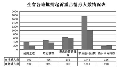 从重点情形看,全省检察机关批准逮捕的黑恶犯罪案件中,非法高利放贷、操纵经营黄赌毒、强揽工程、欺行霸市居前四位,分别达到611件1748人、209件638人、116件389人、142件495人。