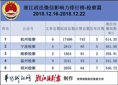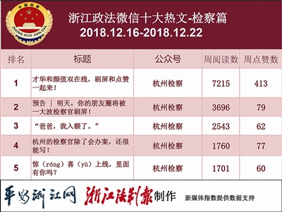 本期检察院榜单,“杭州检察”霸榜了!“杭州检察”不仅位居排行榜第一,且霸占了热文榜单前五。其《才华和颜值双在线,刷屏和点赞一起来!》一文展示了杭州检察部门组织收看“庆祝改革开放四十周年大会”和“庆祝改革开放和检察机关恢复重建40周年”文艺汇演的盛大局面,引来众多关注。