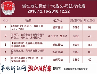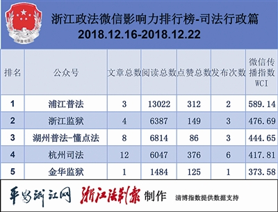 本期司法行政榜单,排名前三的分别是“浦江普法”“浙江监狱”“湖州普法-懂点法”。其中,“浦江普法”《2周后巨变!再见了,微商!再见了,代购!》一文发布的是《中华人民共和国电子商务法》将实施的消息,文章标题新颖,一举获得最高阅读量。