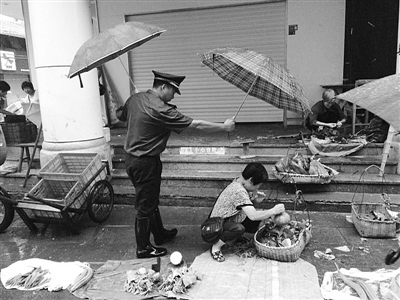 曾经,一位大嫂到我们中队来了3次,要找领导。刚开始我们还以为出了什么事,后来她掏出了一张照片,画面里一位大爷正弯腰捡豆子,身边一名执法人员为他撑着伞,另一名执法人员在帮忙捡豆子。大嫂说:“我用手机拍的,我就想来表扬表扬你们。”