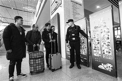 元旦将至,台州市火车站派出所加强安保,确保旅客安全出行。图为昨日,民警在候车大厅开展“一路平安这点事儿”主题宣传,向旅客们讲解旅途安全知识。