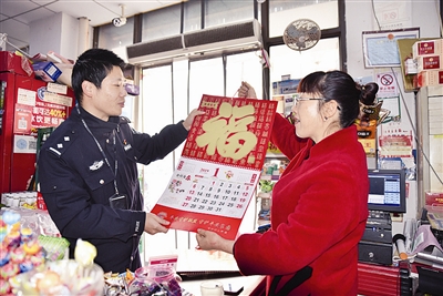 1月1日上午,海盐县百步派出所社区民警李晶来到辖区,走访超市店主、企业主、房东、新居民等辖区群众,为他们宣传安全防范知识,并送上由派出所定制的平安挂历。通讯员 褚斌